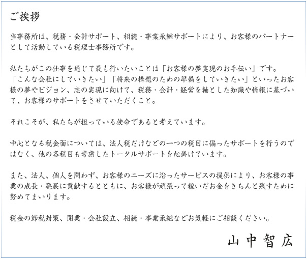 平成19年7月に独立し、「山中智広税理士事務所」を開業、「グローアップコンサルティング株式会社」を設立。